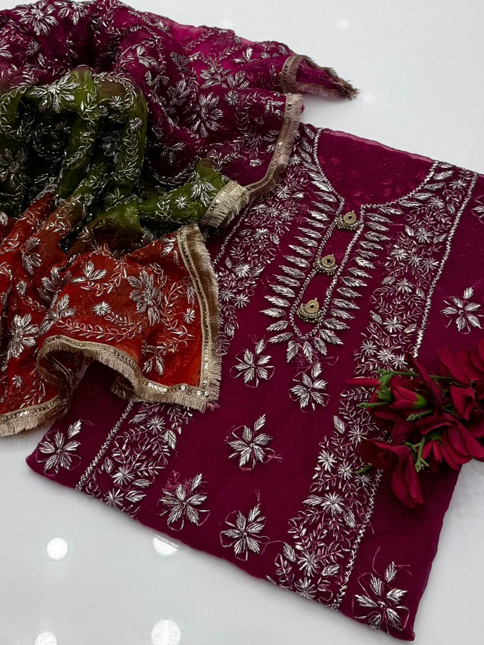 Experience the timeless elegance of traditional craftsmanship with this exquisite Pure Organza Gotta Work ensemble. This sophisticated two-piece suit features premium organza fabric adorned with intricate gotta work detailing across the shirt, showcasing meticulous hand-embroidery that reflects authentic artisanal skill. The standout piece is the stunning three-shaded dupatta, masterfully embellished with matching gotta work that creates a harmonious visual flow throughout the outfit. The carefully selected color gradations in the dupatta add depth and dimension, making this suit ideal for formal occasions and celebrations. Perfect for those who appreciate fine textile artistry and traditional design elements, this ensemble combines comfort with refined aesthetics. The organza's natural drape enhances the overall silhouette while the gotta work embellishments catch light beautifully, ensuring you make a distinguished impression at any event.